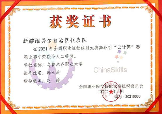近日,全国职业院校技能大赛高职组“云计算”赛项比赛在山东商业职业技术学院成功举办,我校信息工程学院赵静老师指导的计算机网络技术专业1903班学生郭江滨,与来自全国31所高职院校的参赛选手同台竞技,经过3天的激烈角逐,最终荣获全国职业院校技能大赛高职组“云计算”赛项二等奖。